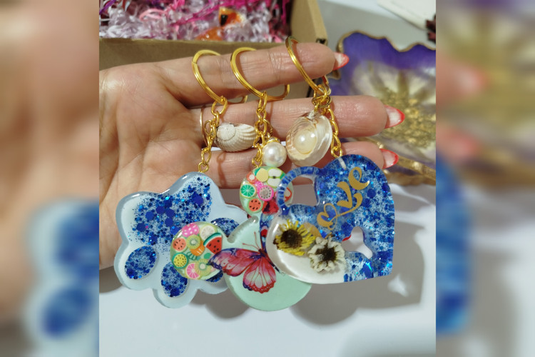 جاکلیدی رزینی در طرح و رنگهای مختلف با حلقه استیل و طلایی سایز تقریبا ۵سانت